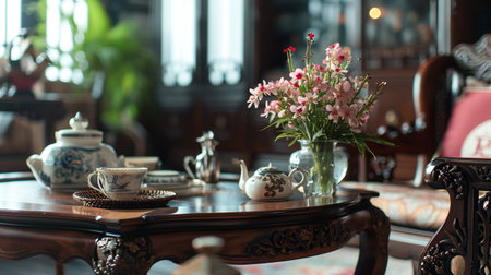 A vintage-style room featuring an antique wooden table with a lace tablecloth, fresh flowers, and an old-fashioned tea set.