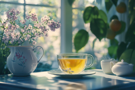 Herbal tea sits on a table next to a delicate floral pitcher and small sugar bowl in a bright kitchen.