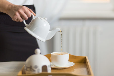 Vertical photo of teapot in woman's hand and cup on wooden table