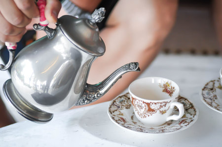 A person elegantly pours steaming tea into a beautifully decorated cup, creating a warm atmosphere.