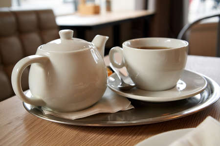 A cup of hot tea with tea pot on a wood table in a cafe.