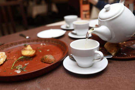 the guy holds the kettle and pours hot tea into the cup. cafe. Red hot herbal tea in the restaurant. pouring tea