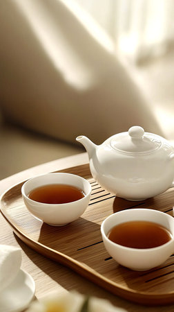 Elegant White Teapot and Cups on Wooden Tray in Cozy Setting. Concept of Tea Culture, Relaxation, Hospitality, and Traditional Refreshments in a Serene Environment. Vertical.