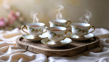 Elegant tea set with floral design and steaming cups on a wooden tray arranged on a soft fabric surface