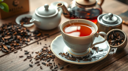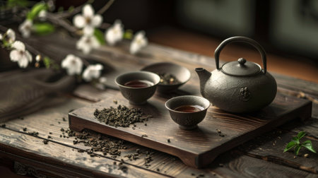 A traditional tea set with a teapot and cups, accompanied by loose tea leaves on a wooden table, creating a serene and cultural tea-drinking experience.