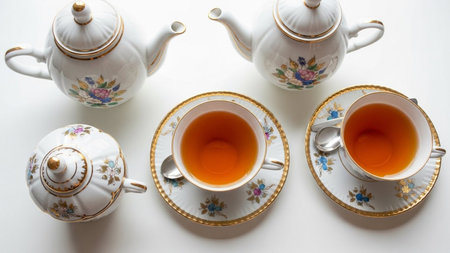Two delicate teacups filled with amber tea sit on ornate saucers, accompanied by two decorative teapots on a white surface.