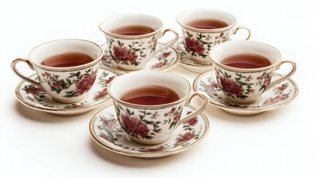 A beautiful set of five vintage floral teacups filled with hot tea, elegantly arranged with matching saucers. Perfect for tea parties, collectors, and classic tableware lovers.