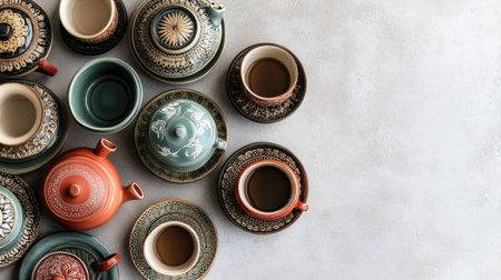 Top view of ceramic tea sets with Indian motifs, clean background, no people, copy space