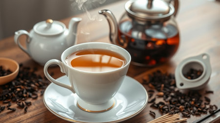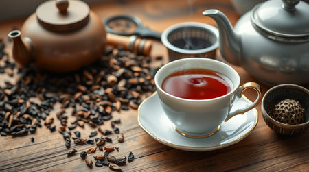 tea in a cup and teapot on a wooden table