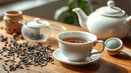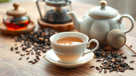Vintage floral tea set with loose leaf tea on sunlit table. That the image is generated using AI.