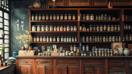 A traditional Chinese herb shop with wooden shelves and jars. No people, copy space.