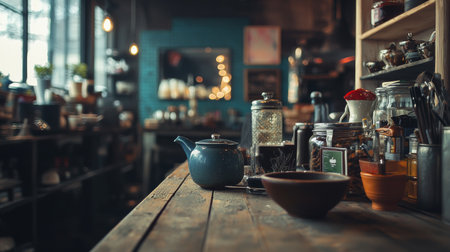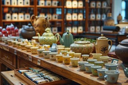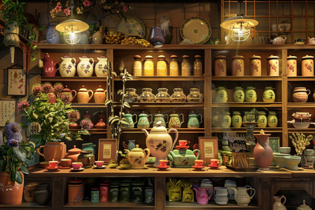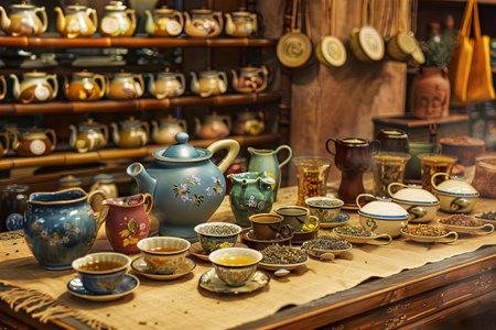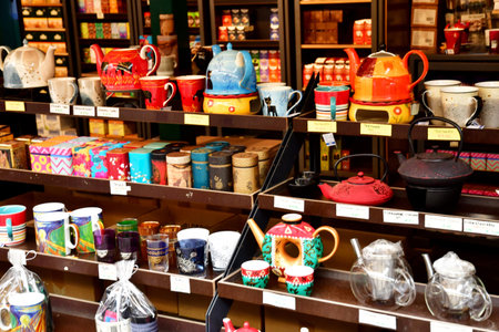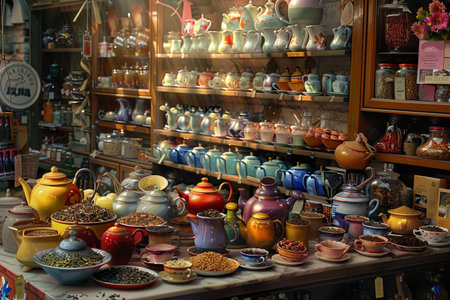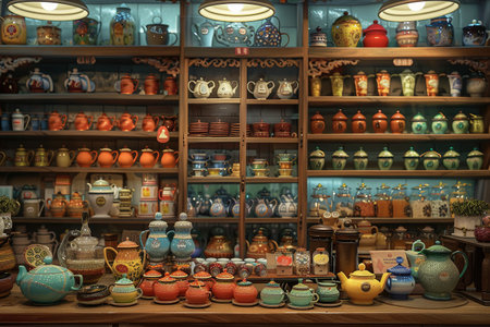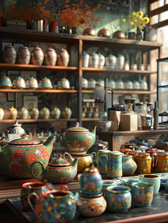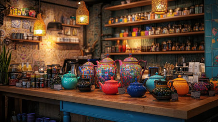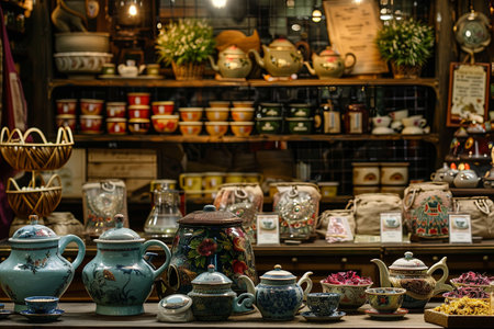 A colorful display of teapots and other items on a counter in a store. The teapots are arranged in a way that catches the eye and invites customers to take a closer look. The store has a cozy