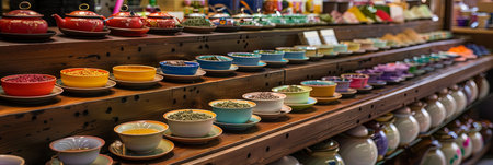 A vibrant store splashed with colors, filled to the brim with a diverse array of beautifully crafted pottery, ranging from delicate teacups to intricate vases.