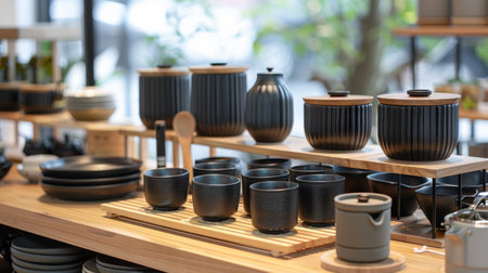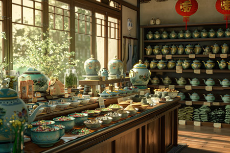 Beautiful tea sets and ceramic bowls neatly arranged on wooden shelves in a cozy shop interior with natural lighting.
