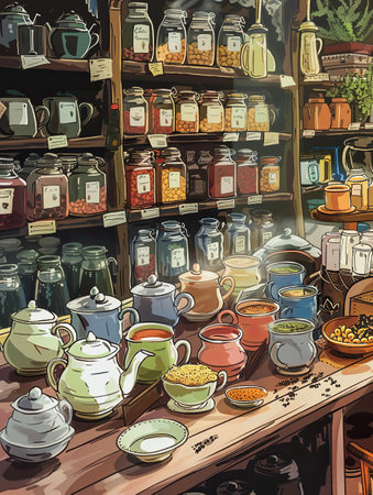 Close-up of colorful glass teapots filled with herbal tea blends, displayed woven baskets of dried leaves and flowers. Vibrant scene capturing essence of traditional tea culture. Tea showcase in shop