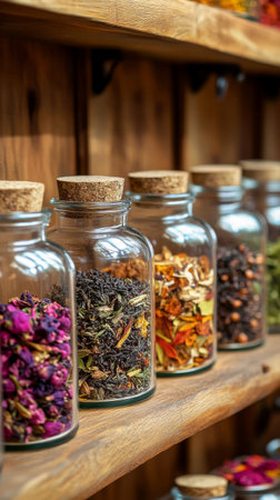 A beautiful arrangement featuring glass jars filled with various herbs, spices, and teas, set on a wooden shelf, ideal for home organization and aesthetics.