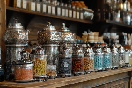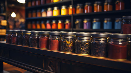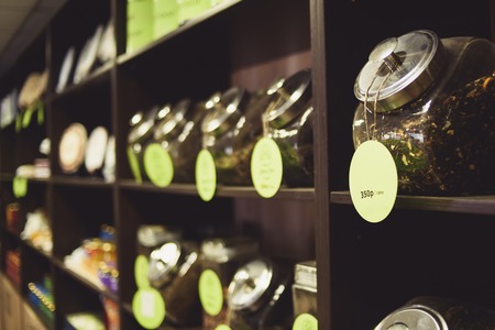 Interior of coffee shop. Glass jars with tea bags on shelves. Toned with retro vintage film effect filters.