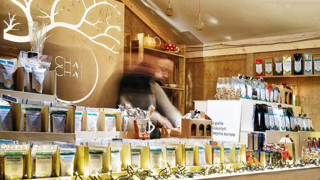 The seller at the counter tastes tea