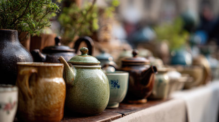 Ceramic pots and teapots for sale at a flea market