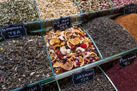 Market with different types of natural organic tea. Oriental bazaar.
