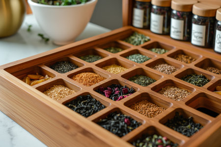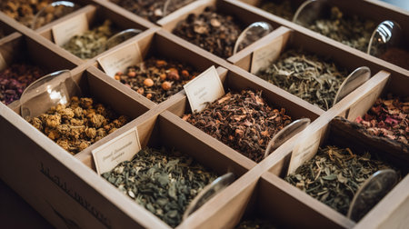 Closeup image showcasing a wooden tea box with compartments, each filled with different types of tea and dry herbs