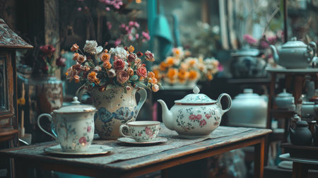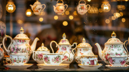 Elegant Display of Vintage Floral Porcelain Teapots and Teacups in a kitchenware Store Window. Concept of Antique Charm, Tea Time Elegance, Decorative Tableware, Crockery, and Sophisticated Shopping.