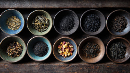 Assortment of dry tea leaves in wooden box
