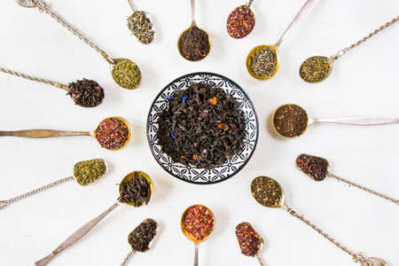 Set of tea on the vintage silverware spoons, various of tea, black, flower, green and mint tea