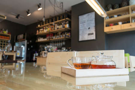 A cup of hot tea with tea pot on a wood table in a cafe.