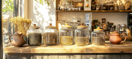 Glass jars with dry tea leaves on the counter of a coffee shop