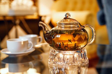 Red tea brewed in a glass teapot. The sun shines through a glass teapot during a tea ceremony. Beautiful atmosphere of the tea ceremony in the morning.