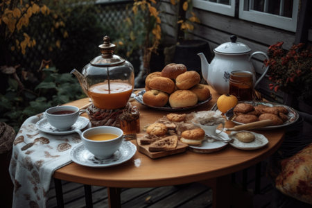 cozy outdoor table setting with teapot, tea cups, and pastries for afternoon tea, created with generative ai
