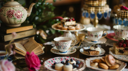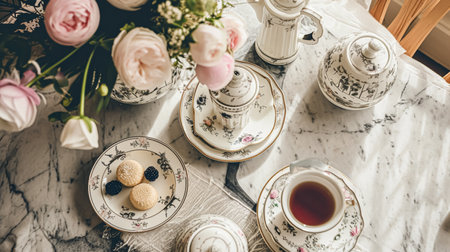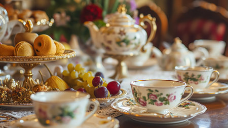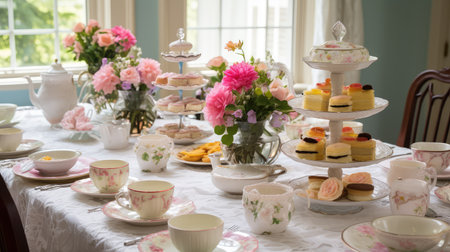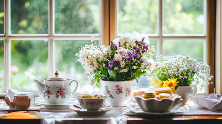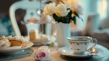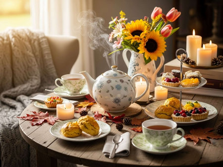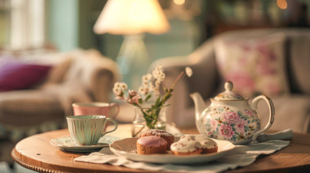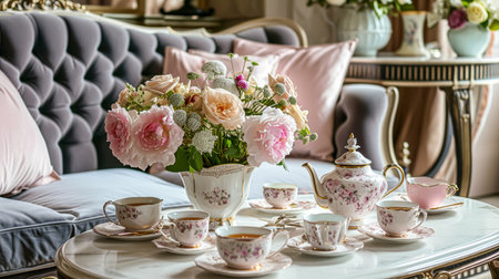 An inviting scene presents a tea setting featuring a decorative teapot and teacup accompanied by pastries on plates. Lush floral arrangements in vases add color, set against a blurred indoor backdrop. The warm lighting and soft textures suggest a comfortable, interior setting, suitable for various editorial and promotional applications.