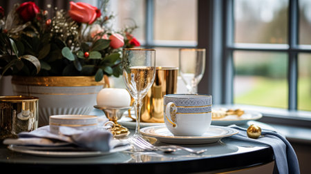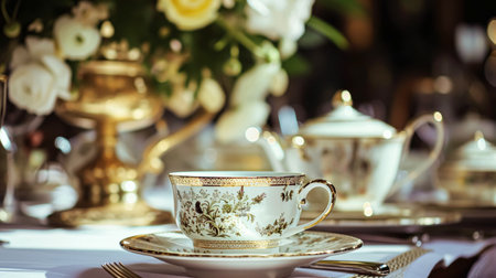 This stunning image showcases an elegant dining table set with exquisite china and beautiful floral arrangements. The luxurious golden accents enhance the sophisticated ambiance, creating a perfect setting for a gourmet meal or celebration.