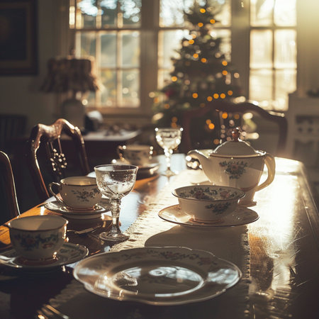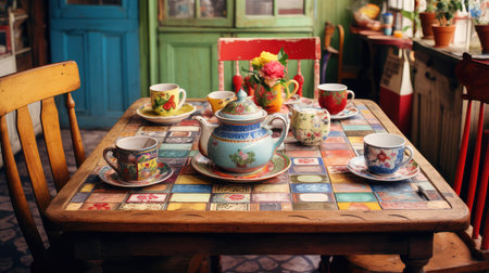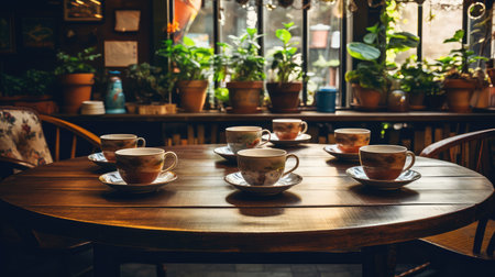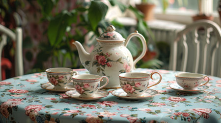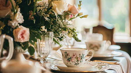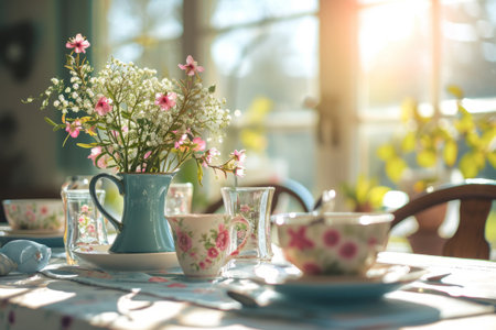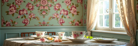 Vintage floral dining room with sunlit tea setting and elegant china cups. That the image is generated using AI.
