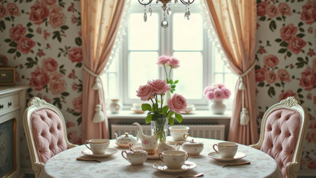 Vintage floral tea room with elegant pink rose decor and classic china set. That the image is generated using AI.