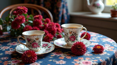 Elegant floral teacups with red chrysanthemums on patterned tablecloth by window. That the image is generated using AI.