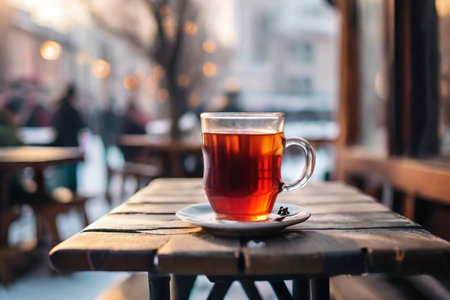Hot tea cup on wooden cafe table on the street outdoor. Front view banner with copy space. Black tea in clear glass on small plate