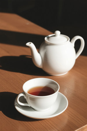 Teapot and teacup on wooden table