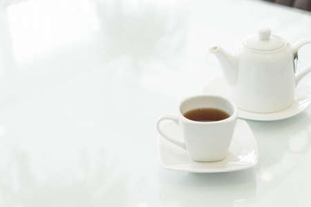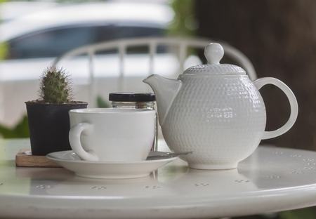 A cup of hot tea with tea pot on a wood table in a cafe.