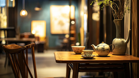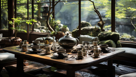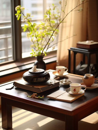 Generative AI : Traditional east asian tea cup and tea pot with notebooks and plants in front of windows