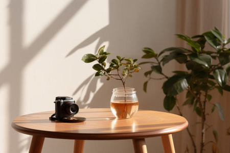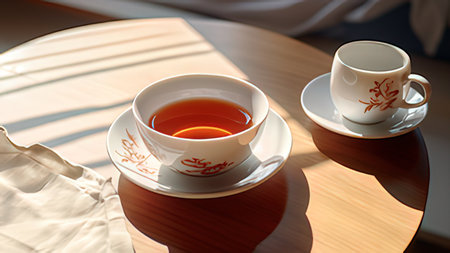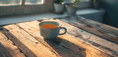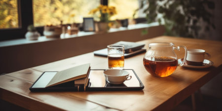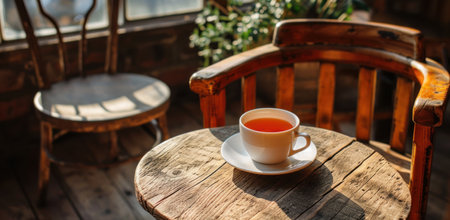 A wooden table topped with a cup of tea. Generative AI image.