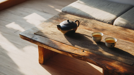 Minimalist tea ceremony setup on a wooden table with a single ceramic teapot, two cups, and soft morning light