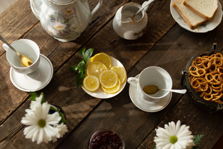 Tea party. Porcelain tea set and sliced fresh lemons on plate standing on wooden table.