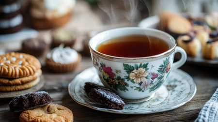 A charming scene featuring a ceramic cup of steaming tea alongside a variety of cookies on a rustic wooden table, perfect for a cozy moment.