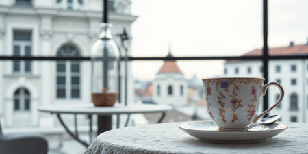A delicate tea cup with floral design on a saucer in a cozy indoor setting