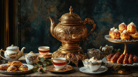This stunning vintage tea set is elegantly arranged with an assortment of pastries and sweets, creating a warm and inviting atmosphere perfect for gatherings.