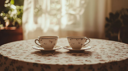 A charming tea setting featuring two floral porcelain cups on a vintage tablecloth, illuminated by warm sunlight, creating a cozy and inviting atmosphere.