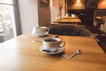 White cup of hot tea with bag and spoon on table in cafe