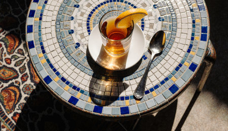 A vibrant mosaic table holds a glass of tea adorned with a slice of orange. The sunlight casts soft shadows, enhancing the cozy setting of an outdoor cafe.